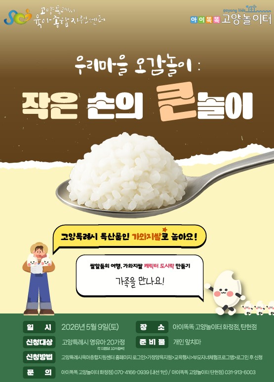* 각 지점마다 신청 가능 인원이 상이하므로 지점명을 확인 후 신청해 주시기 바랍니다. * 영유아 1명이 1팀입니다. * 더 많은 가정의 참여를 위한 1가정당 1지점만 신청 가능하오니 이 점 참고하여 주시기 바랍니다. * 개인 앞치마를 준비해 주세요! 3. 신청 방법: - 아이똑똑고양놀이터 화정점 : 2026년 5월 9일(토) 10:30~11:20, 10가정 >신청하러 바로가기< 1) 고양특례시육아종합지원센터 홈페이지 로그인하기 2) 원하는 지점, 원하는 시간대는 선택 → 하단의 신청하기 눌러 신청 완료 3) 2026년 5월 9일(토) 10시 30분 시간에 맞춰 신청 지점으로 방문하기! 4) 부모님과 함께 즐겁게 체험 프로그램 참여하기 5) 만족도 조사서 제출하기 * 아이똑똑 고양놀이터 상황에 따라 프로그램 일정이 변경이 될 수 있습니다.