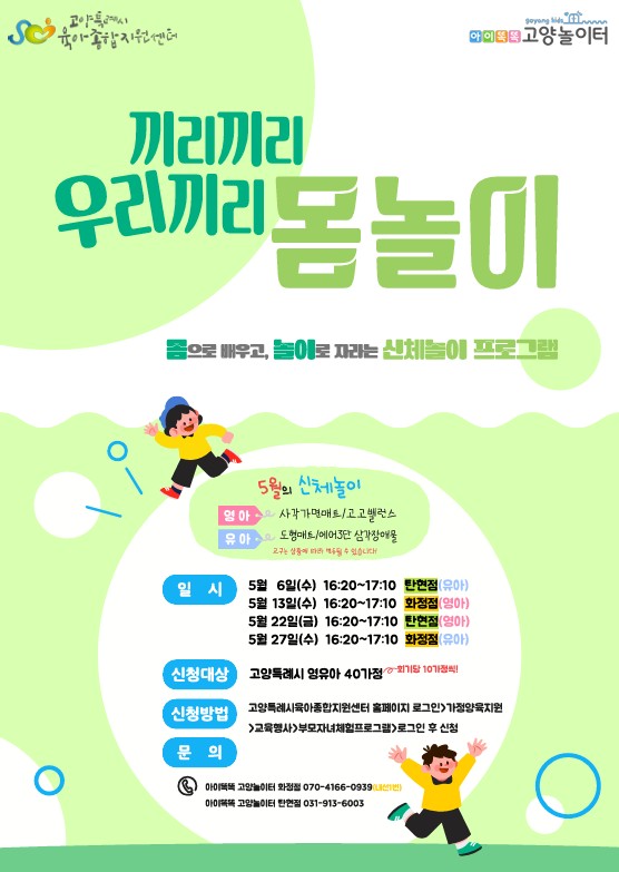 3. 신청방법: ** 끼리끼리 우리끼리, 몸놀이(영아) : 2026년 5월 13일(수) 16:20~17:10, 10가정 → 신청하러 바로가기 ** 끼리끼리 우리끼리, 몸놀이(유아) : 2026년 5월 27일(수) 16:20~17:10, 10가정 → 신청하러 바로가기 1. 고양특례시육아종합지원센터 홈페이지 로그인 하기 2. 진행 일자에 맞춰 신청 지점으로 방문하기 3. 부모님과 함께 즐겁게 체험프로그램 참여하기 4. 만족도조사서 제출하기 5. 환경보호 실천으로 일회용 컵이 제공되지 않습니다. 환경을 생각하여 텀블러 지참 부탁드립니다.