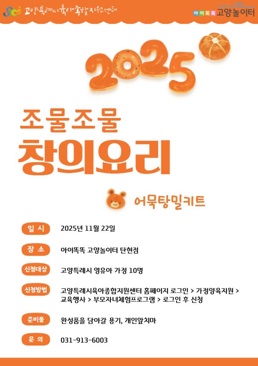 * 각 지점마다 신청 가능 인원이 상이하므로 지점명을 확인 후 신청해주시기 바랍니다. * 영유아 1명이 1팀입니다. * 더 많은 가정의 참여를 위한 1가정당 1지점만 신청 가능하오니 이 점 참고하여 주시기 바랍니다. * 개인앞치마와 완성품을 담아갈 용기를 꼭 가져와주세요! 3. 신청방법: - 아이똑똑 고양놀이터 탄현점 : 2025년 11월 22일(토) 10:30~11:30, 10가정 >신청하러 바로가기< 1) 고양특례시육아종합지원센터 홈페이지 로그인 하기 2) 2025년 11월22일(토) 10시30분에 맞춰 신청 지점으로 방문하기! 3) 부모님과 함께 즐겁게 체험프로그램 참여하기 4) 만족도조사서 제출하기 * 아이똑똑 고양놀이터 상황에 따라 프로그램 일정이 변경이 될 수 있습니다.