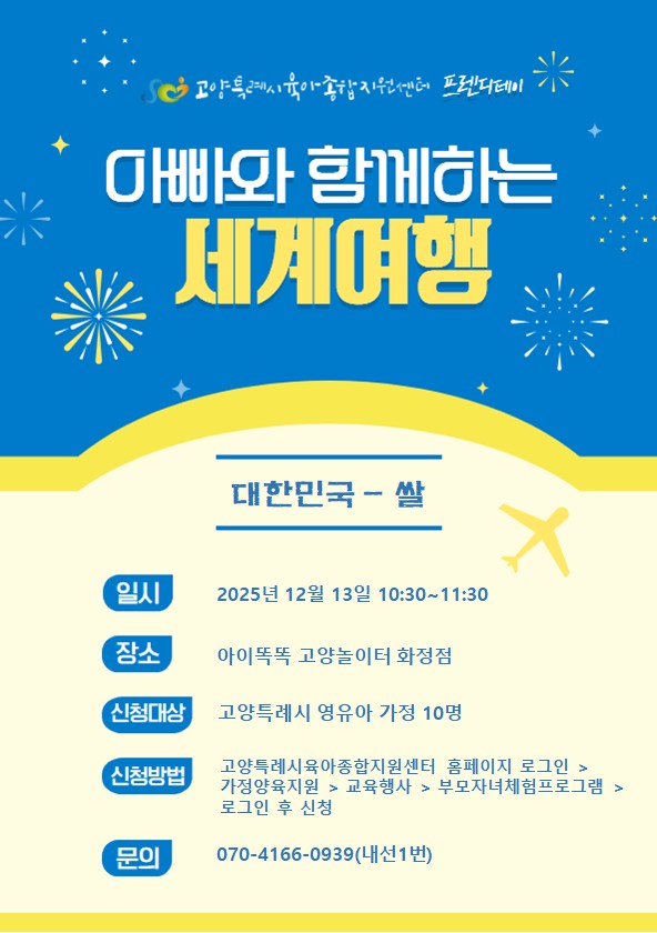 - 아이똑똑 고양놀이터 화정점 : 2025년 12월 13일(토) 10:30~11:30, 10가정 >신청하러 바로가기<