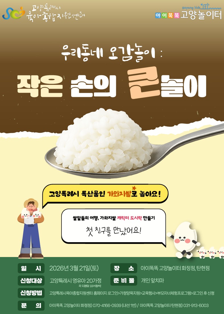 * 영유아 1명이 1팀입니다. * 더 많은 가정의 참여를 위한 1가정당 1지점만 신청 가능하오니 이 점 참고하여 주시기 바랍니다. * 준비물: 개인앞치마 3. 신청방법: - 아이똑똑 고양놀이터 탄현점 : 2026년 3월 21일(토) 10:30~11:20, 10가정 >신청하러 바로가기< 1) 고양특례시육아종합지원센터 홈페이지 로그인 하기 2) 2026년 3월 21일(토) 10시30분에 맞춰 신청 지점으로 방문하기! 3) 부모님과 함께 즐겁게 체험프로그램 참여하기 4) 만족도조사서 제출하기 5) 환경보호 실천으로 일회용 컵이 제공되지 않습니다. 환경을 생각하여 텀블러 지참 부탁드립니다. * 아이똑똑 고양놀이터 상황에 따라 프로그램 일정이 변경이 될 수 있습니다.