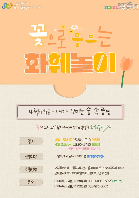 2. 신청대상: 고양특례시 관내 미취학 영유아 가정 10팀 * 화훼놀이 프로그램은 활동 특성상 유아 이상의 참여를 권장드립니다. * 더 많은 가정의 참여를 위한 1가정당 1지점만 신청 가능하오니 이 점 참고하여 주시기 바랍니다. 3. 신청방법: 2026년 3월 31일(화) 11:00 ~ 선착순 마감 >신청하러 바로가기< 1) 고양특례시육아종합지원센터 홈페이지 로그인 하기 2) 2026년 4월 23일(목) 16시20분에 맞춰 신청 지점으로 방문하기! 3) 부모님과 함께 즐겁게 체험프로그램 참여하기 4) 만족도조사서 제출하기 5) 환경보호 실천으로 일회용 컵이 제공되지 않습니다. 환경을 생각하여 텀블러 지참 부탁드립니다. * 아이똑똑 고양놀이터 상황에 따라 프로그램 일정이 변경이 될 수 있습니다.