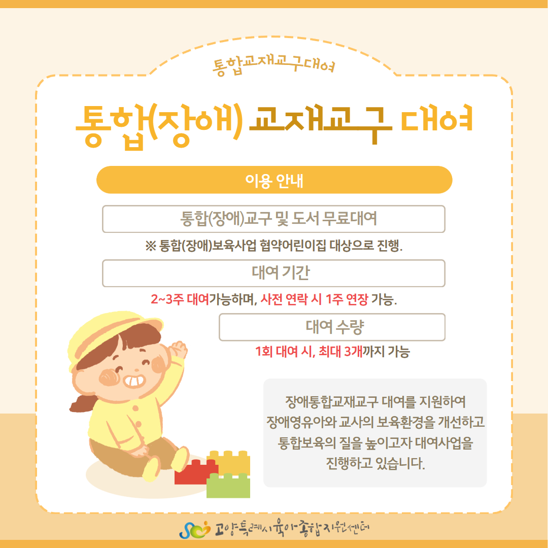 고양특례시육아종합지원센터에서는 고양시 관내 장애아통합·전문어린이집 중 통합(장애)보육사업 협약어린이집을 대상으로