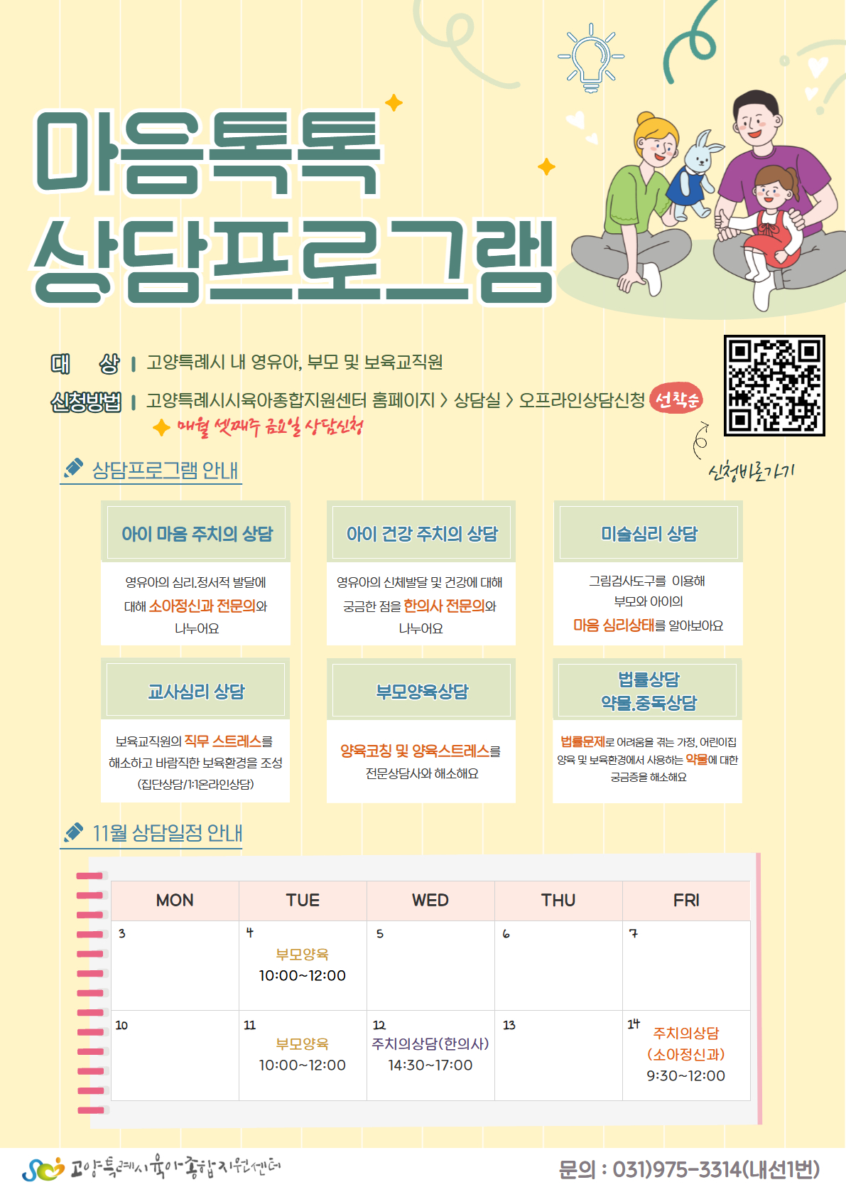 2025년 11월 상담프로그램 신청 안내 (*2025년 마지막 상담) 고양특례육아종합지원센터에서는 고양시 영유아, 부모, 어린이집과 보육교직원을 대상으로 전문적인 상담과 정보를 제공하고자 상담사업을 진행하고 있습니다. 하단에 있는 2025년 상담프로그램 안내문을 참고하시기 바랍니다.