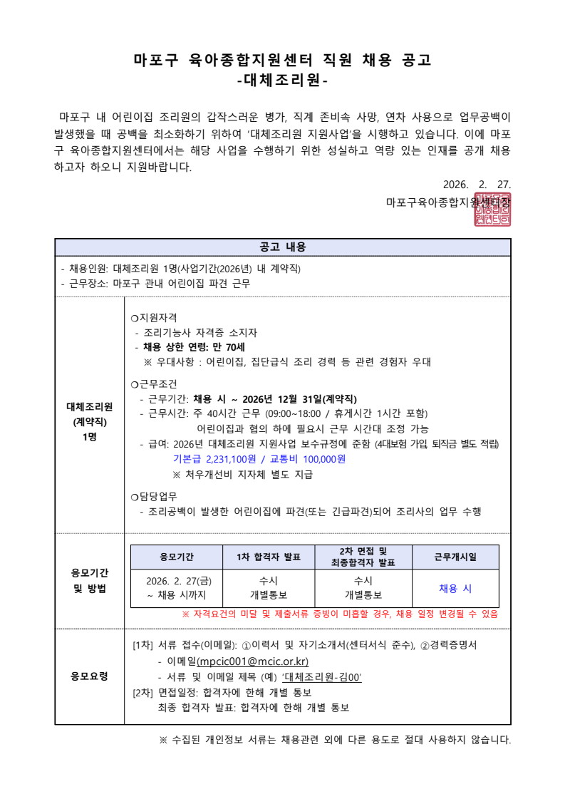 | [마포구육아종합지원센터] 2026년 대체조리원 채용공고 | |||||