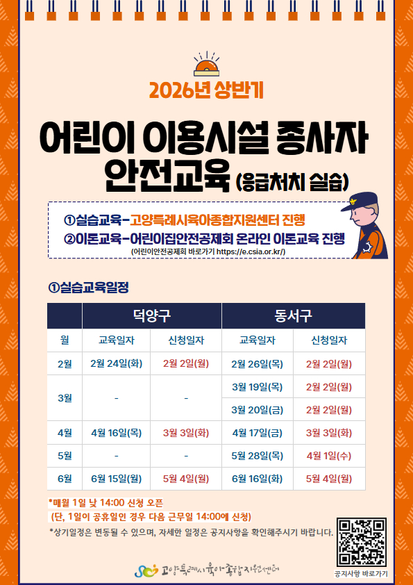 2026년 상반기 어린이 이용시설 종사자 안전교육(응급처치실습) 일정을 안내드립니다. 다음 사항을 확인하시고 신청 부탁드리겠습니다.