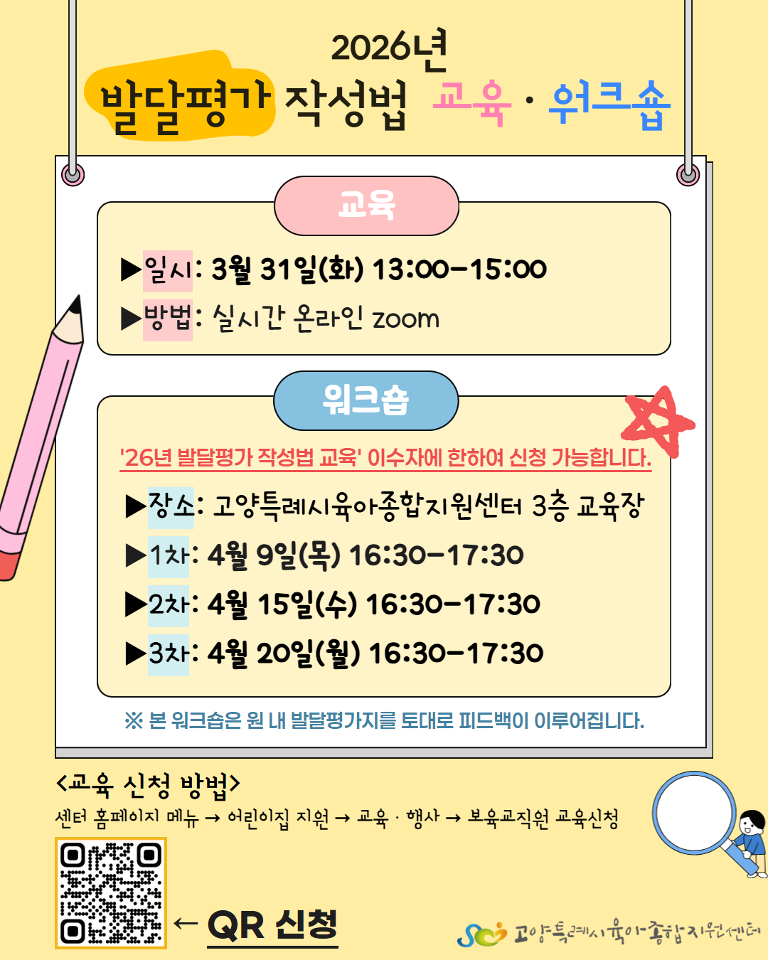 '2026년도 발달평가 작성법 교육' 이수자에 한하여 '발달평가 작성법 워크숍' 신청이 가능하므로 이점 참고해주시기 바라며,