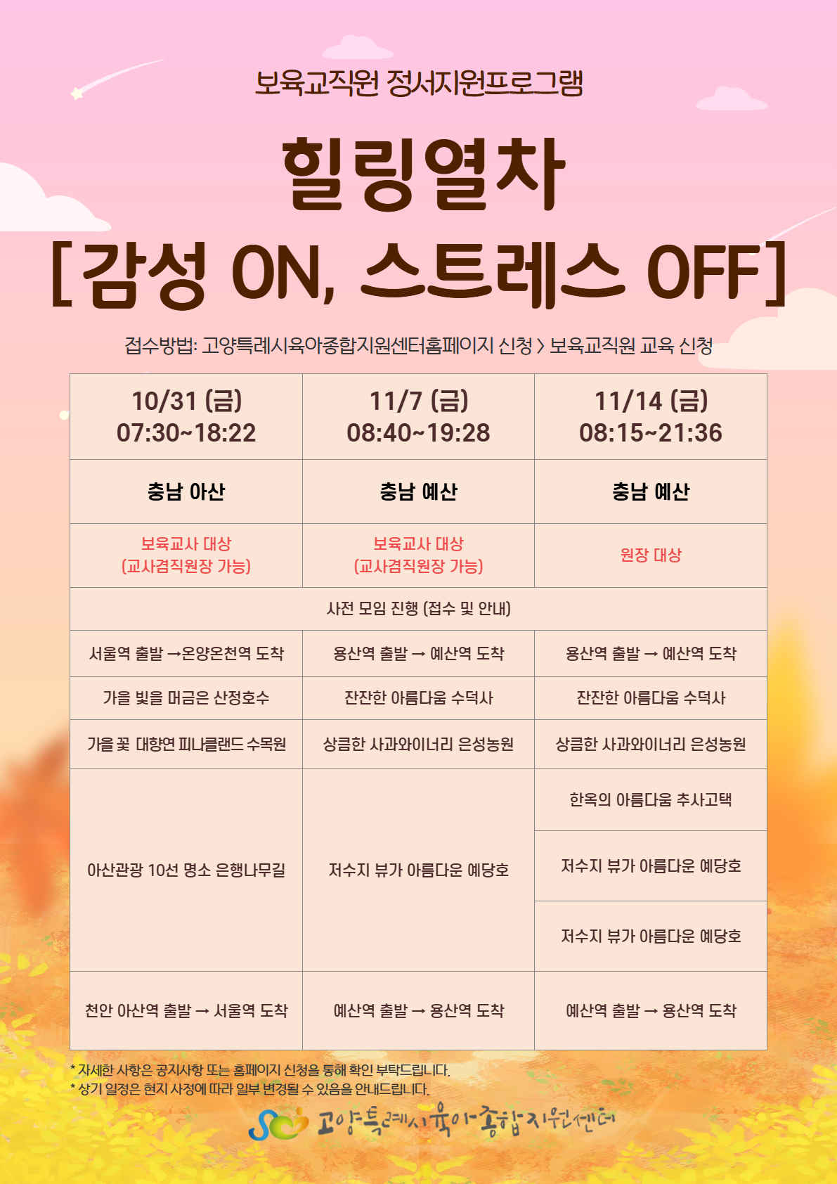[감성 ON, 스트레스 OFF] 안내 고양특례시육아종합지원센터는 보육교직원의 스트레스 완화 및 정서를 지원하고자 보육교직원 힐링열차를 진행합니다. 많은 참여 부탁드립니다.