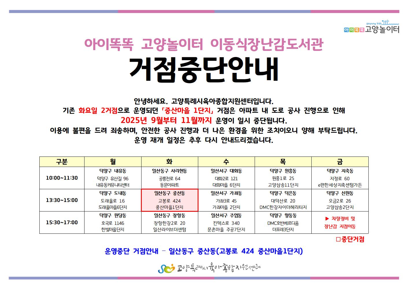 [아이똑똑 고양놀이터] 이동식장난감도서관 거점중단안내