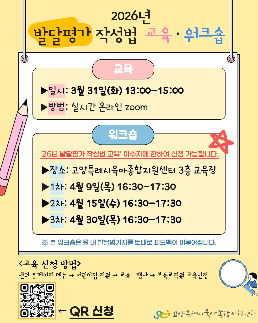 '2026년도 발달평가 작성법 교육' 이수자에 한하여 '발달평가 작성법 워크숍' 신청이 가능하므로 이점 참고해주시기 바라며,