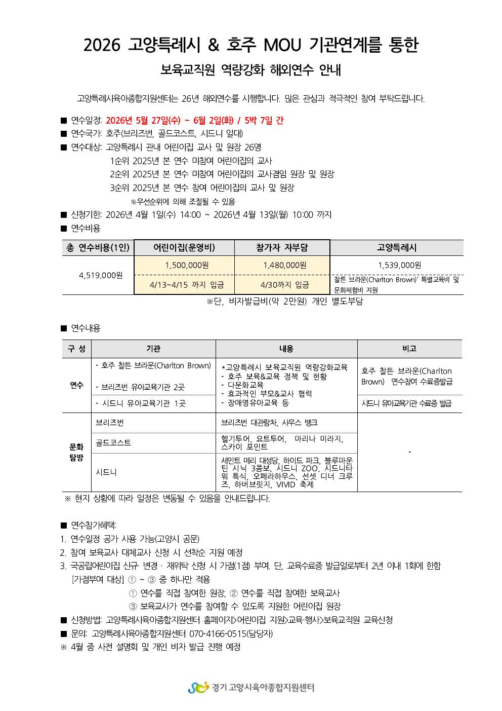 | 2026 고양특례시&호주 MOU 기관연계를 통한 보육교직원 역량강화 해외연수 안내 | |||||