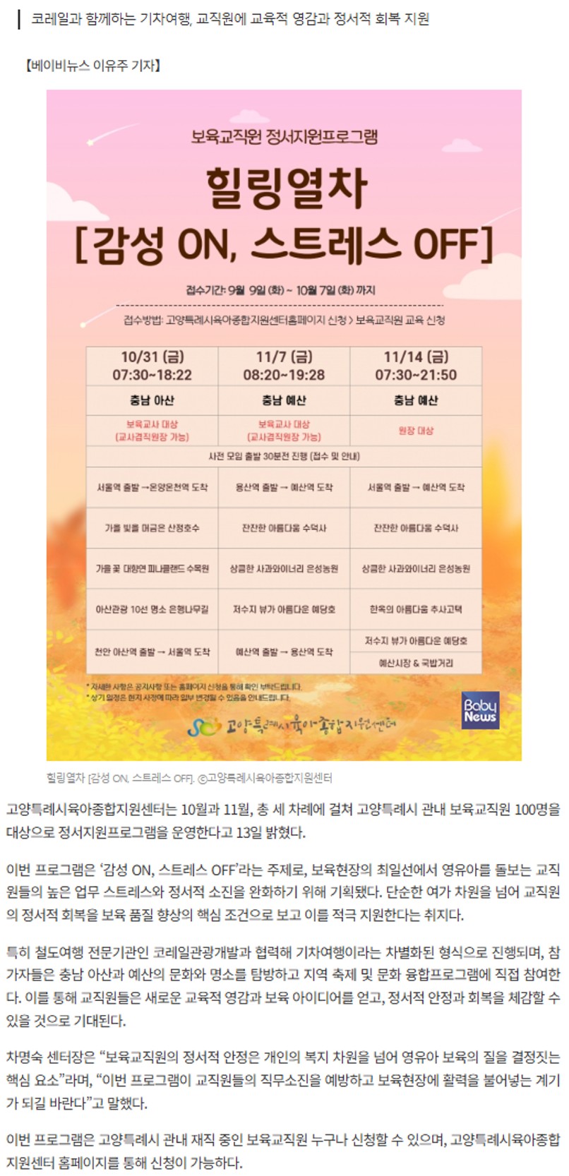 | 고양특례시육아종합지원센터,정서지원프로그램 보육교직원 힐링열차 '감성 ON, 스트레스 OFF' 진행 | |||||