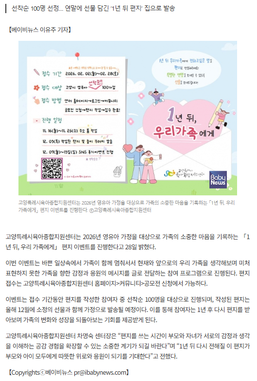 | 고양특례시육아종합지원센터, 2026 가족 이벤트 ‘1년 뒤, 우리 가족에게’ 진행 | |||||