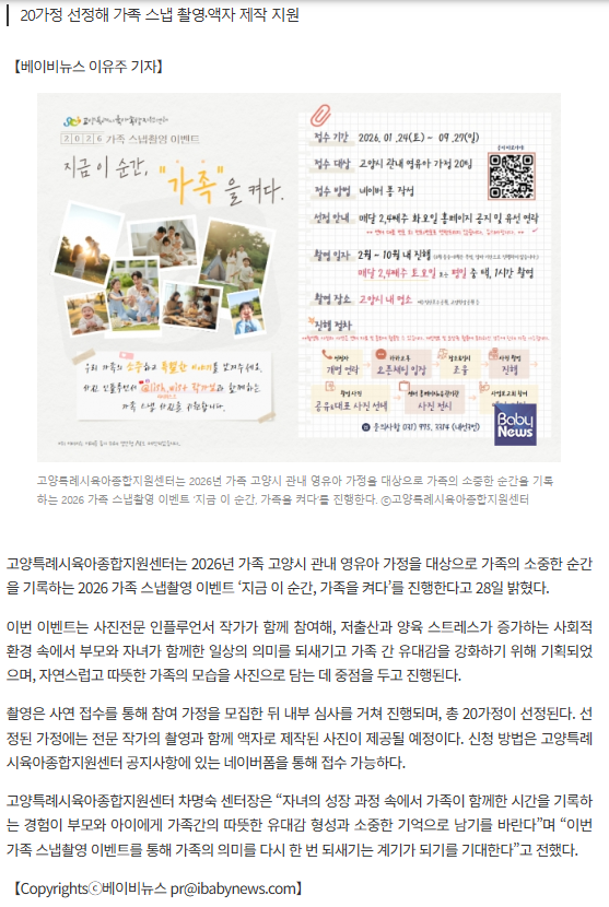 | 고양특례시육아종합지원센터, 2026 가족 스냅촬영 이벤트 ‘지금 이 순간, 가족을 켜다’ 진행 | |||||
