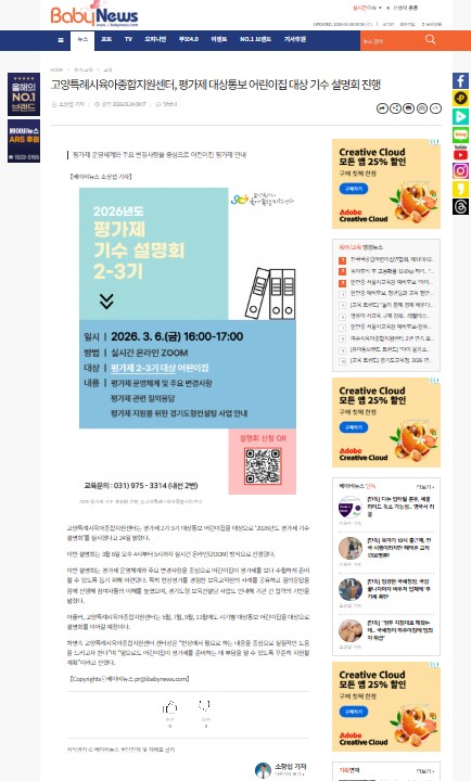 | 다음글 | 고양특례시육아종합지원센터, 어린이집 개정평가제 대비 맞춤형 컨설팅 운영 강화 | ||||