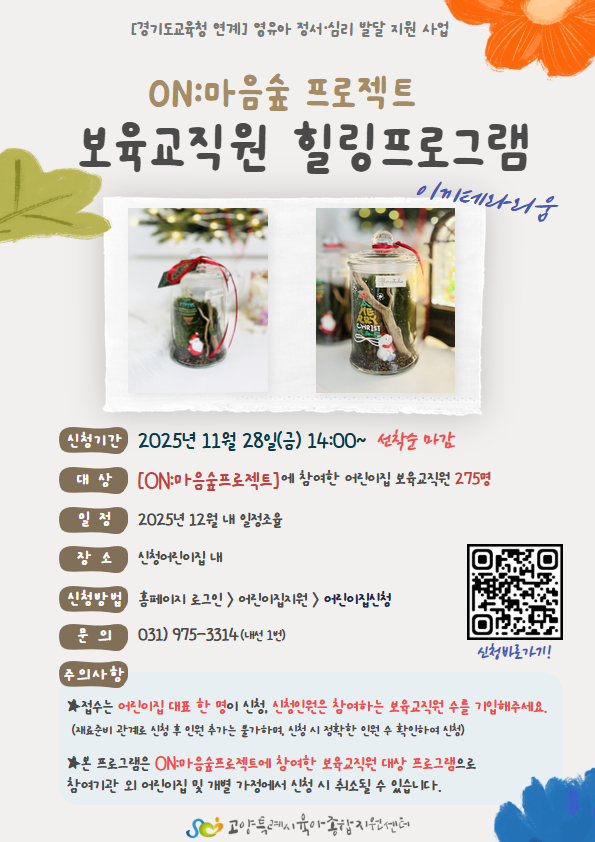 -본 프로그램은 ON:마음숲프로젝트에 참여한 어린이집 보육교직원 대상 프로그램으로 참여기관 외 어린이집 및 개별가정에서 신청 시 취소될 수 있습니다.