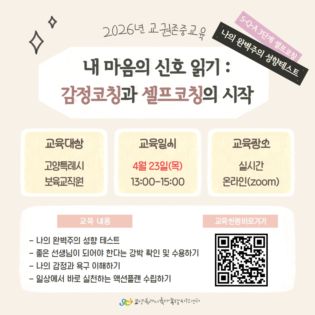| (실시간 온라인) 내 마음의 신호 읽기: 감정코칭과 셀프코칭의 시작(교권존중교육) | ||||||||||||||||
