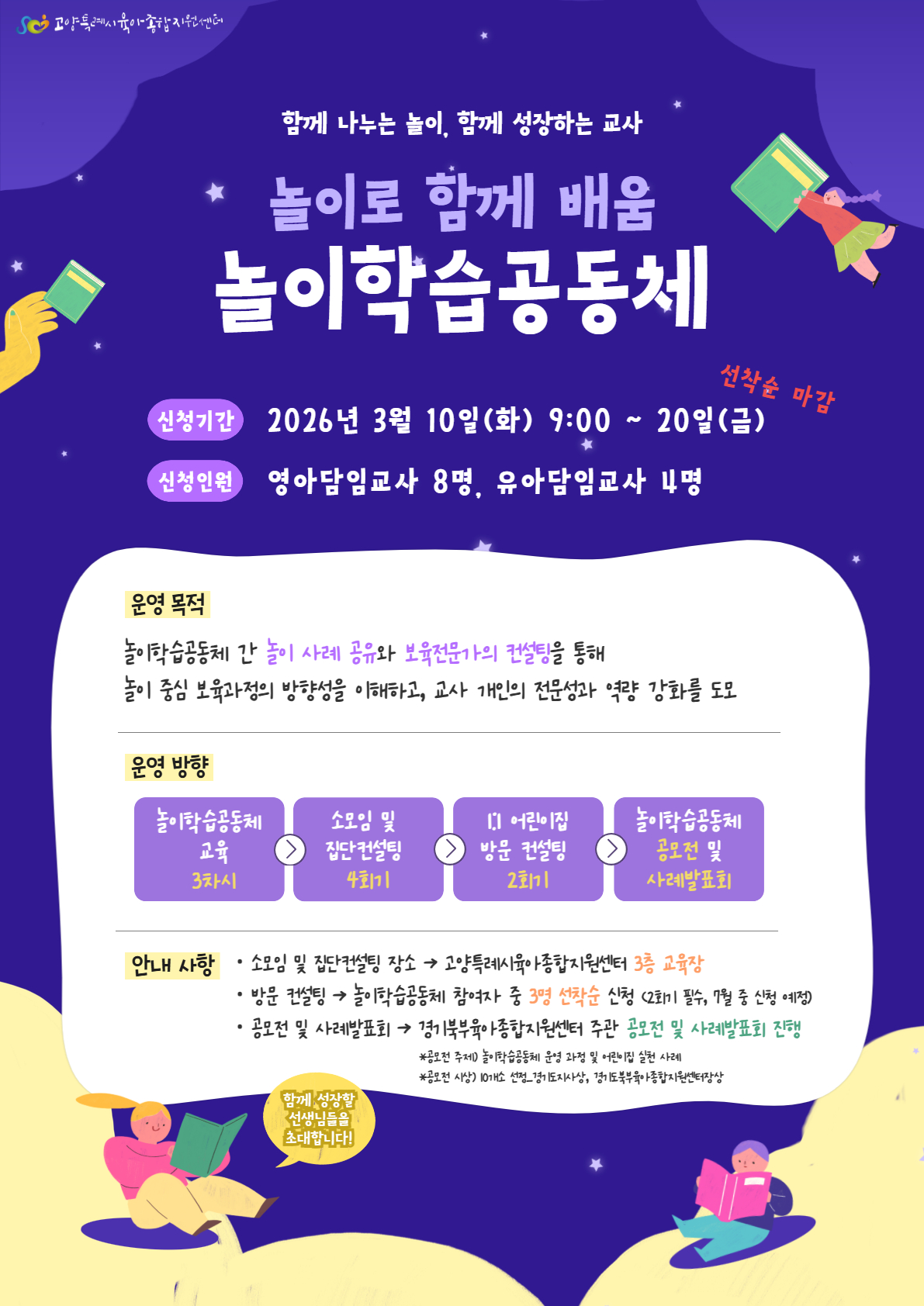 ○ 참여대상 : 고양특례시 관내 어린이집 영아반 담임 교사 4명(A그룹) ○ 신청기간 : 2026. 3. 10.(화) ~ 3. 20.(금) 선착순 마감 ○ 교육 : 4월 ,6월, 7월 중 실시간 온라인(ZOOM)으로 진행(자세한 일정은 추후 안내) ○ 소모임 및 집단 컨설팅 : 6월~9월 중 매월 1회 16:00~18:00(총 4회) 고양특례시육아종합지원센터 3층 교육장(자세한 일정은 추후 안내) ○ 1:1 어린이집 방문 컨설팅: 8월~9월 중 신청 어린이집과 일정 조율하여 2회기 진행(7월 중 신청 예정이며 선착순 마감) ○ 공모전 및 사례발표회: 8월~12월(자세한 내용은 공지사항 확인)