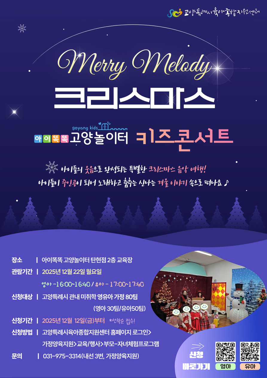 4. 공연 신청 방법: 1) 고양특례시육아종합지원센터 홈페이지 로그인 하기 2) 하단의 신청하기 눌러 신청완료 3) 2025년 12월 22일(월) 시간에 맞춰 아이똑똑 고양놀이터(탄현점) 2층 교육장으로 오기! 4) 부모님과 함께 즐겁게 공연보기 (양육자 1인 동반 가능) 5) 만족도조사서 제출하기 * 아이똑똑 고양놀이터 상황에 따라 프로그램 일정이 변경이 될 수 있습니다. 5. 기타문의: 031-975-3314(내선 3번, 가정양육지원) ***안내사항***