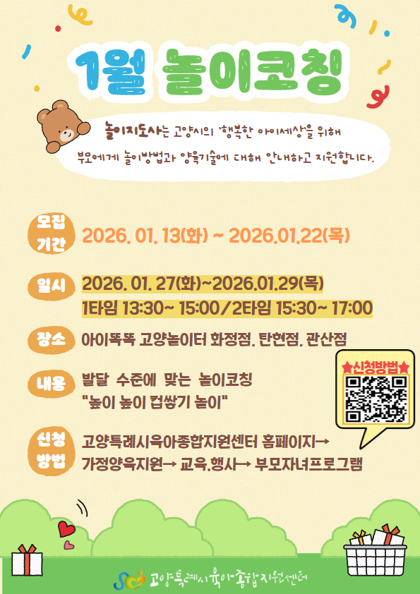 | [놀이지도사업] 1월 놀이코칭 프로그램 (아이똑똑 고양놀이터 탄현점 2타임 -15:30~17:00) | |||