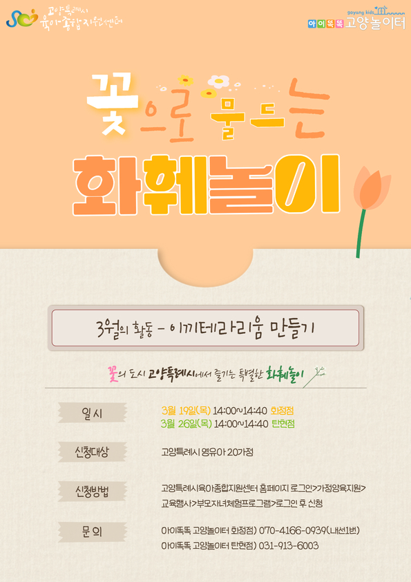 3. 신청방법: 1) 고양특례시 육아종합지원센터 홈페이지 로그인 하기 2) 원하는 지점 선택 → 하단의 신청하기 눌러 신청완료 3) 2026년 3월 19일(목) 14:00까지 시간에 맞춰 신청 지점으로 방문하기! 4) 즐겁게 체험프로그램 참여하기 5) 만족도조사서 제출하기 * 아이똑똑 고양놀이터 상황에 따라 프로그램 일정이 변경이 될 수 있습니다.
