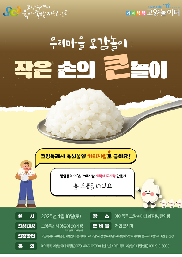 고양특례시 아이똑똑 고양놀이터 우리마을 오감놀이 작은 손의 큰 놀이 프로그램 안내 가와지쌀 캐릭터 도시락 만들기 봄 소풍을 떠나요