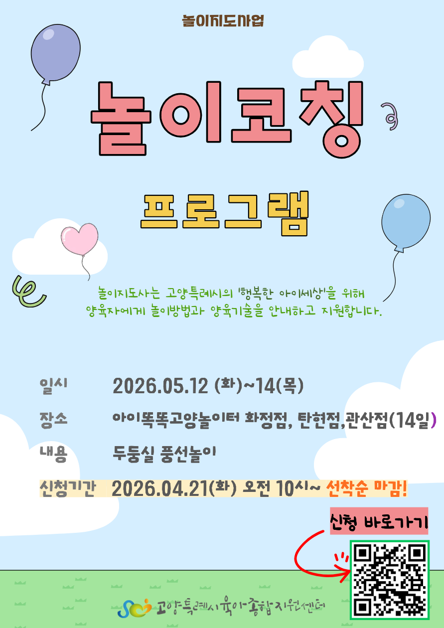 | [놀이지도사업] 5월 놀이코칭 프로그램 (아이똑똑 고양놀이터 화정점 1타임 -13:30~15:00) | |||