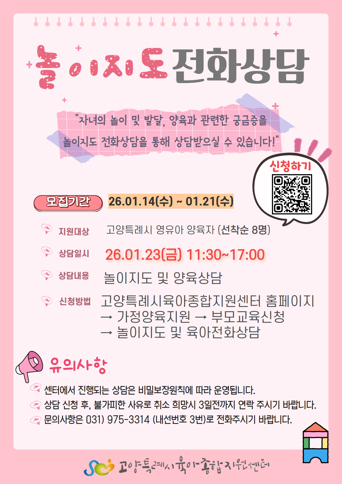 * 구 분 : 개별 전화상담(1인 기준 1회 20분 내) * 대 상 : 고양시 영유아 자녀를 둔 양육자 * 상담내용 : 놀이지도 및 양육상담 등 * 상담일 : 2026년 01월 23일 금요일 11:30~17:00 중 전화드립니다. * 신청방법 : 홈페이지 신청 / 해당 일자 1일 8명 선착순 접수 * 유의사항 - 활동참여확인서 발급가능 - 상담 취소는 상담 2일전 연락주시기 바랍니다. - 해당 신청 회차에 전화 연결 2회 이상 받지 않으신 경우 다음 분 상담을 준비하게 되며, 자동 취소 됩니다. (부득이하게 전화를 받지 못하셨을 경우 센터로 (당일) 회신주시기 바랍니다. - 상담 전 프로그랜 안내 문자를 통해 설문조사 진행합니다. 설문지를 작성해주시면 상담 시간소요 절약 및 원활한 상담이 이루어질 수 있습니다. ( 설문지 문자발송 ) |