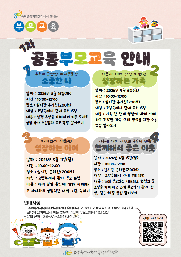 - 수료증은 ① 교육 시작 후 15분 이내 입장, ② 교육 일정 끝까지 참석, ③ 기한 내 만족도조사 실시 3가지 모두 충족일 경우 발급 가능합니다. - 발급방법: 유선 신청→ 개인 메일로 공통부모교육 수료증 발급(일주일 소요) -고양특례시육아종합지원센터 031)975-3314 공통부모교육 담당자-